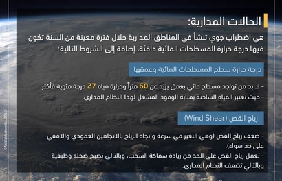يعتمد نمو وتطور الحالات المدارية بشكل اساسي وكبير على تواجد مسطح مائي بعمق يزيد عن 60 متراً وحرارة مياه 27 درجة مئوية فأكثر، وتعتبر المياه الساخنة بمثابة الوقود المشغل لهذا النظام الاستوائي.