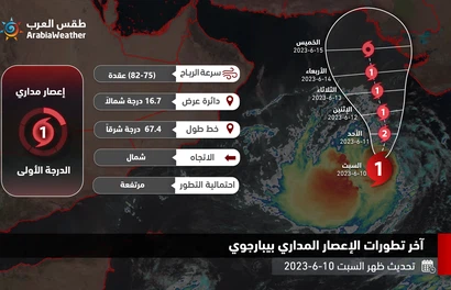 وأشار التقرير إلى وجود احتمالية عالية لتطور الإعصار الإعصار المداري بيبارجوي في بحر العرب إلى الدرجة الثالثة يوم الجمعة، دون وجود أي تأثيرات مباشرة على السلطنة خلال الأيام الـ 3 القادمة.