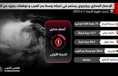 وتشير آخر مخرجات النمذجة العددية المعتمدة لدينا في طقس العرب بتوافر الظروف لحدوث تطور إضافي على اعصار بيبارجوي لينتقل رسمياُ من الدرجة الأولى إلى الثانية خلال الـ 48 ساعة القادمة.