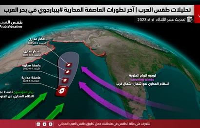 نراقب في"مركز طقس العرب الإقليمي" تطورات ومستجدات الحالة المدارية المُصنفة كعاصفة مدارية في بحر العرب، وتشير التوقعات بتحرك الاعصار نحو سواحل الهند الباكستان خلال الـ 24 ساعة القادمة