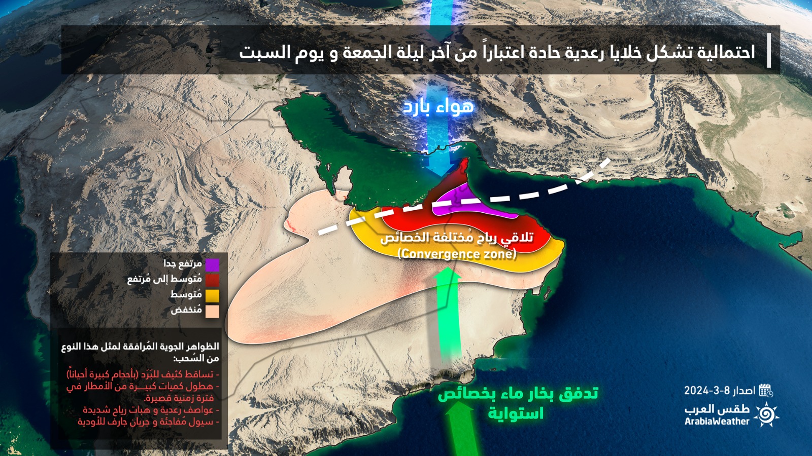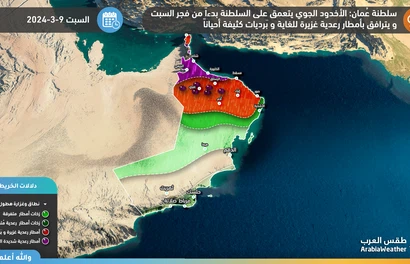 ونتابع في مركز المراقبة الخاص بتتبع الحالات الماطرة الاستثنائية في مركز "طقس العرب"، امتداد الحالة الماطرة واشتدادها خلال نهار يوم السبت على سلطنة عُمان، بحيث متوقع بمشيئة الله أن تتشكل سحب رعدية قوية وحادة على أجزاء عدة في سلطنة عمان تشمل محافظة مسندم والبريمي والظاهرة وشمال وجنوب الباطنة والداخلية ومسقط وشمال وجنوب الشرقية، تكون مرفقة بهطول غزير جداً من الأمطار تكون مصحوبة بتساقط البرد ونشاط على العواصف الرعدية والرياح الهابطة، مما يؤدي إلى جريان الأودية والشعاب وراتفاع منسوب المياه.