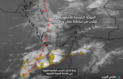 من مركز طقس العرب - تُشير أحدث صور الأقمار الاصطناعية بأن الموجة الرئيسية المُرافقة لأخدود المُنخفض الجوي بدأت بالاقتراب من سلطنة عُمان و الإمارات، بحيث بدأت السُحب الركامية القوية بالتشكل جنوب الإمارات و صحراء الربع الخالي.