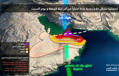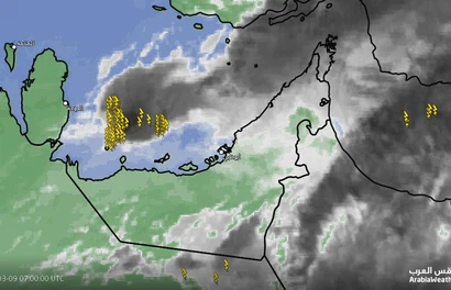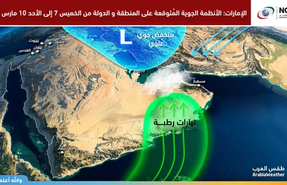 طقس العرب - أشار المركز الوطني للأرصاد في الإمارات في تقريره بأن الإمارات على موعد مع حالة جوية ماطرة جديدة نهاية الأسبوع تُصنف بأنها مُتوسطة إلى قوية في بعض المناطق، و هي ناتجة عن امتداد مُنخفض جوي في طبقات الجو العليا مصحوباً بكتلة هوائية رطبة بالتزامن مع امتداد مُنخفض جوي سطحي من الجنوب الغربي يصاحبه رياح جنوبية شرقية إلى شمالية شرقية رطبة.