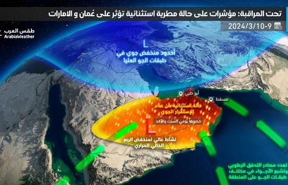 من مركز طقس العرب - تُشير أحدث القراءات الجوية و الناتجة عن ما يُسمى بالمُحاكاة الحاسوبية توقعات بأن تتأثر جنوب شرق منطقة شبه الجزيرة العربية بما فيها سلطنة عُمان بحالة ماطرة استثنائية و تتسبب بهطول أمطار غزيرة للغاية مُرفقة بالبرق و الرعد و تساقط البَرَديات الكثيفة أحياناً، و ترتفع بذلك فرص تشكل السيول و جريان الأودية و الشعاب في مناطق عِدّة.