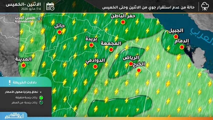 اعتبارا من يوم الاثنين، تشتد حالة عدم الاستقرار الجوي على المرتفعات الجنوبية الغربية و تهطل زخات رعدية غزيرة من المطر خاصة خلال ساعات الظهيرة و العصر تعمل على فيضان الاودية و تشكل السيول، حيث يتوقع ان تكون الامطار ذات غزارة عالية في بعض المناطق من مرتفعات جازان و عسير و ربما اجزاء من مرتفعات الباحة و جنوب مكة المكرمة.