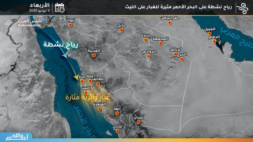 طقس العرب - سنان خلف - تزداد الإشارات لدينا في طقس العرب على تأثر مدنية جدة إضافة لمُحافظة الليث يوم الأربعاء برياح شمالية غربية نشطة مع هبات قوية السرعة أحياناً.