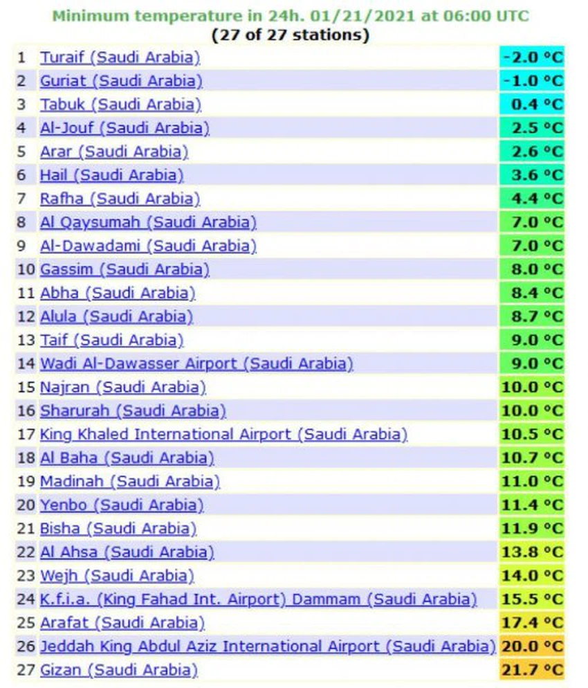وفيما يلي درجات الحرارة الصغرى المسجلة فجر وصباح يوم الخميس 21/1/2021: