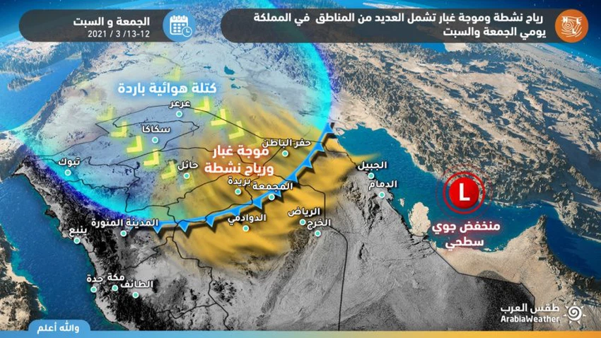 وفي التفاصيل فيُتوقع أن تتأثر منطقة بلاد الشام وأقصى شمال المملكة العربية السعودية بمنخفض جوي نهاية الأسبوع، هذا المنخفض سيدفع بعد مشيئة الله برياح قوية السرعة نحو عموم مناطق شمال ووسط وشرق المملكة وشرق المملكة، تصل سرعة بعض هباتها إلى حدود 100 كم/ساعة، وهذه الرياح تعتبر كفيلة بتشكيل موجات غبارية واسعة تترافق بتدني كبير في مدى الرؤية الأفقية.