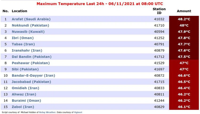 طقس العرب - سنان خلف - بحسب منظمة الأرصاد العالمية المسؤولة عن تجميع درجات الحرارة المُسجلة لغايات التوثيق من مراصد الدول، فقد سجل مشعر عرفات في مكة المكرمة أعلى درجة حرارة عظمى على وجه الكرة الأرضية خلال الـ 24 ساعة الماضية وحتى الساعة 12 من ظهر يوم الجمعة 11/6/2021 حيث بلغت 48.2 درجة مئوية.