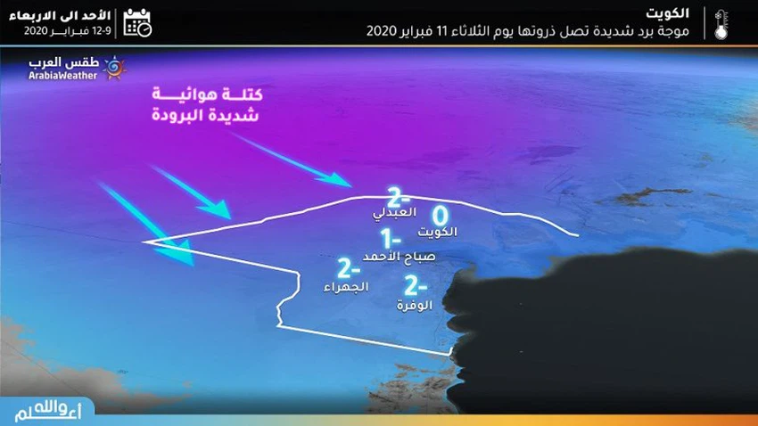 طقس العرب - سنان خلف - حذر كادر التنبؤآت الجوية في مركز طقس العرب الإقليمي من الكُتلة الهوائية الباردة التي انفصلت من القطب الشمالي وتواصل اندفاعها نحو المنطقة، والتي سيكون لها تأثيرات مباشرة على دولة الكويت بخفض درجات الحرارة لمستويات كبيرة تصل إلى مادون الصفر المئوي في معظم المناطق.