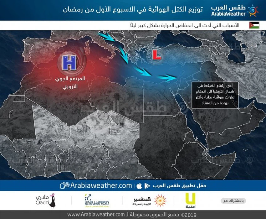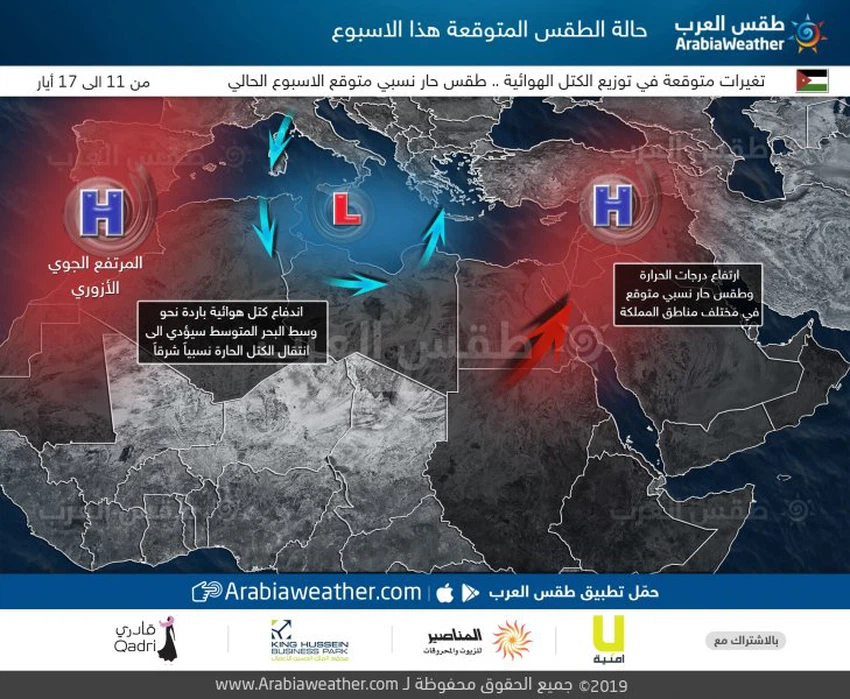 ويحتمل مع نهاية الأسبوع، ان تنخفض درجات الحرارة في مختلف مناطق المملكة، بالتزامن مع تأثر شرق المملكة بحالة محدودة من عدم الاستقرار الجوي (سحب رعدية وأمطار متفرقة) في تلك المناطق.