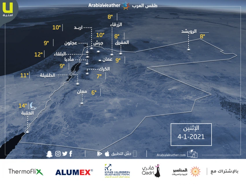 طقس العرب - تستمر درجات الحرارة أعلى من مُعدلاتها لمثل هذا الوقت من العام بِعدّة درجات، لكن تنخفض درجات الحرارة الملموسة عما ستكون عليه الأحد نتيجة نشاط الرياح، ويكون الطقس بارداً نسبياً وغالباً مُشمس في أغلب المناطق، ومائلاً للدفء في مناطق الأغوار والبحر الميت والعقبة.