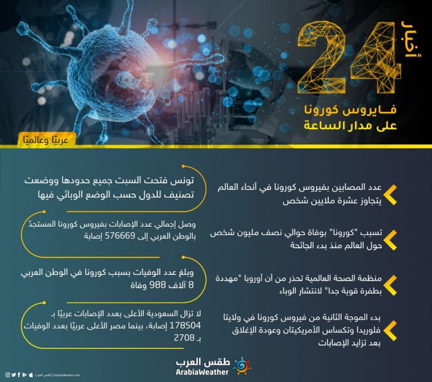طقس العرب- لا يزال العالم يكافح انتشار وباء كورونا حول العالم منذ ظهوره أواخر عام 2019، ولاتزال تطورات المرض تشغل العالم بشكل عام والعالم العربي بشكل خاص.