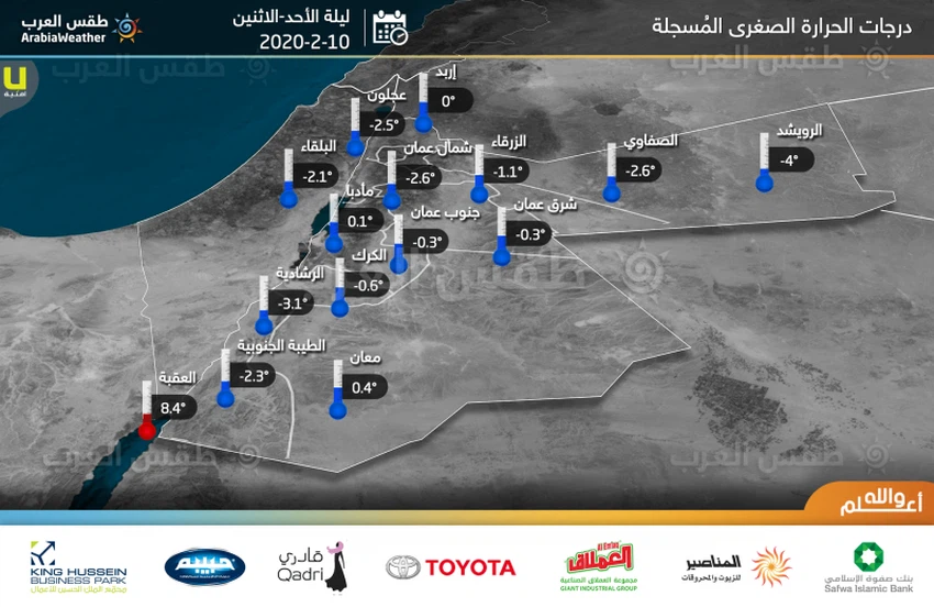 و سجّلت بعض محطات أحياء العاصمة عمان درجات حرارة وصلت إلى -3 مئوية تحت الصفر. كما سجّلت كل من محطة الرويشد -4 مئوية مئوية فيما سجلت في الرشادية -3.1