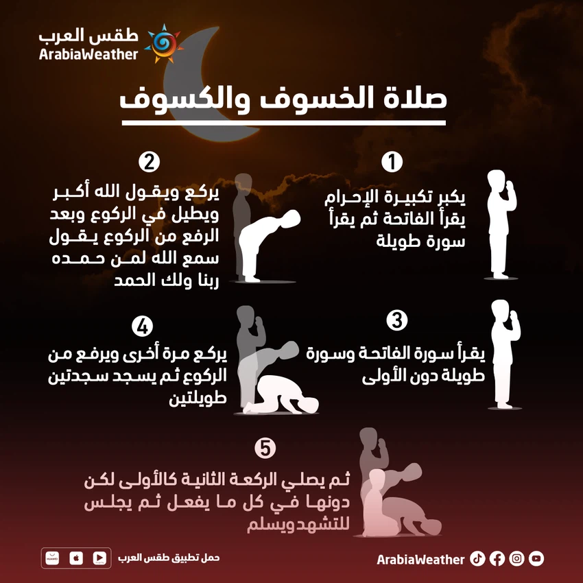 طقس العرب - سنان خلف - يترقب العالم ظاهرة كسوف الشمس لمشاهدة الكسوف الحلقي النادر الذي سيُشاهد بوضوح في عددٍ من دول المنطقة، بينها السعوية الامارات وسلطنة عُمان، والكسوف هو ظاهرة فلكية لاتضر ولاتنفع، كما ذكر نبينا صلى الله عليه وسلم في الحديث «إِنَّ الشَّمْسَ وَالْقَمَرَ لَا يَنْكَسِفَانِ لِمَوْتِ أَحَدٍ وَلَا لِحَيَاتِهِ، وَلَكِنَّهُمَا آيَتَانِ مِنْ آيَاتِ اللهِ جل وعلا يُخَوِّفُ بِهِمَا عِبَادَهُ، فَإِذَا كُسِفَا فَافْزَعُوا إِلَى الصَّلَاةِ»