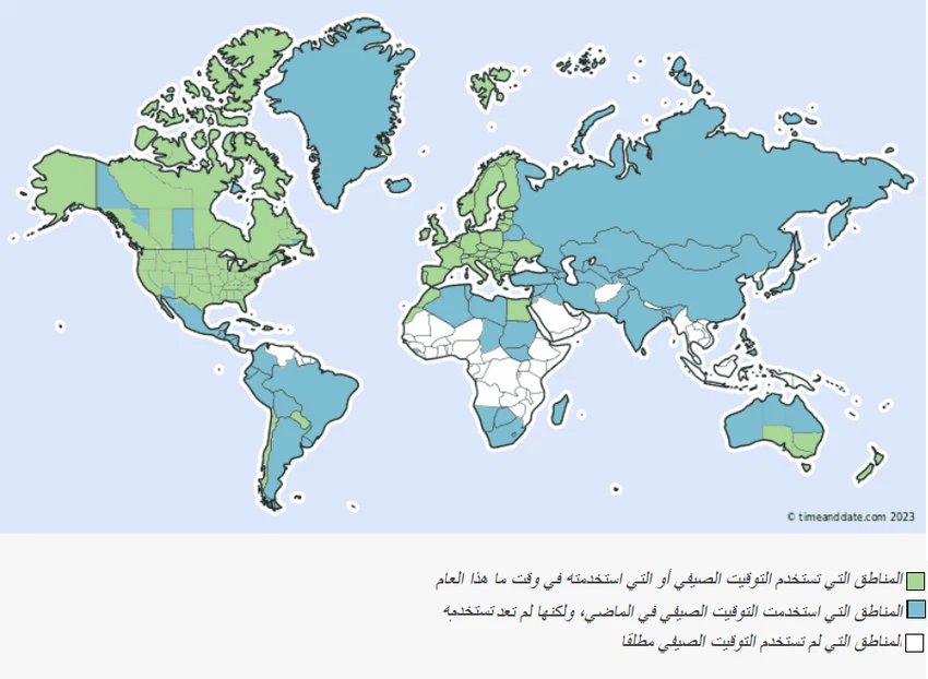 وهذه خريطة بالمناطق في العالم التي تقوم بتغيير الوقت إلى التوقيت الصيفي: