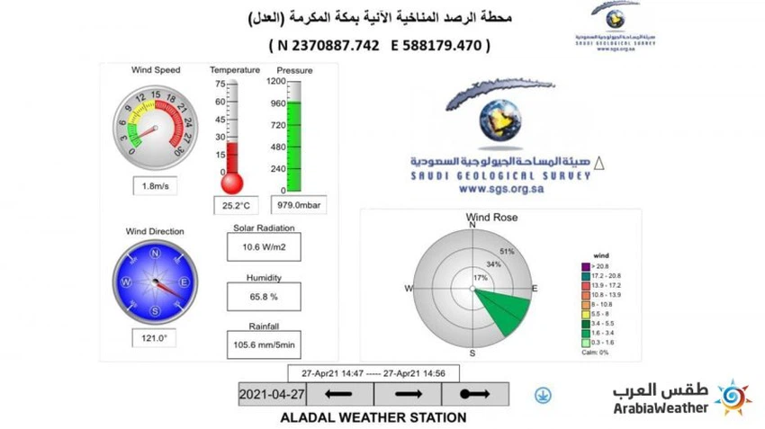 طقس العرب - سنان خلف - شهدت مدينة مكة المكرمة عصر اليوم الثلاثاء هطولاً غير معتاد للأمطار الرعدية بغزارة وكثافة عالية، وسجلت محطات الرصد التابعة لهيئة المساحة الجيولوجية السعودية في حي العدل بمدينة مكة المكرمة معدلاً مرتفعاً لغزار الأمطار الهاطلة بلغ 105.6 ملم خلال 5 دقائق فقط!، وهو ما يفسر مداهمة السيول لبعض الطرق والأحياء السكنية.