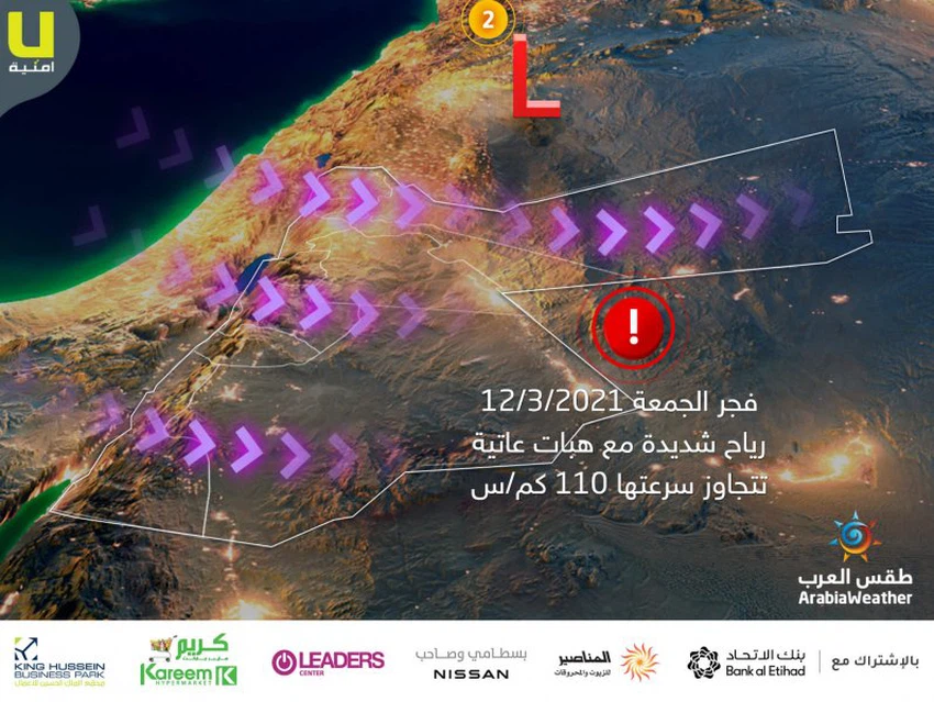 طقس العرب - يُتوقع "بمشيئة الله" أن تشهد عموم مناطق المملكة ليلة الخميس/الجمعة ليلة عاصفة نتيجة تأثر البلاد بمُنخفض جوي (التفاصيل من هُنا) حيث تهُب رياح غربية شديدة السرعة ومصحوبة بهبات عاتية، حيث لا يُستبعد ان تكسر سرعة الهبات حاجز الـ 110كم/ساعة في بعض المناطق و خاصة في جنوب و شرق البلاد.