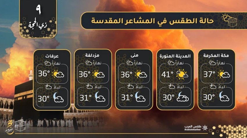 طقس العرب - تُشير آخر التوقعات الجوية الصادرة عن كادر التنبؤات في طقس العرب إلى أن الأجواء ستكون مستقرة بشكلٍ عام في المشاعر المقدسة خلال يوم عرفة، ولا توجد أي فرص لتعرض المنطقة لهطولات مطرية والله أعلم.