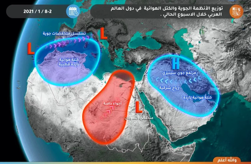 طقس العرب - تتوزع الأنظمة الجوية خلال الأسبوع الحالي في العالم العربي بين سلسلة منخفضات جوية في القسم الغربي، ومرتفع جوي سيبيري في القسم الشرقي وكتلة هوائية دافئة فوق وسطه، وهي منظمة جوية لا تختلف كثيراً عن الأسبوع السابق.
