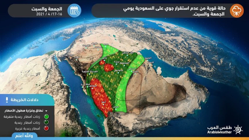 وفي التفاصيل تشير آخر التوقعات إلى أن نشوء أحوال جوية غير مستقرة يومي الجمعة والسبت، تكون قوية ومُترافقة بالأمطار الرعدية الغزيرة وزخات البرد على مرتفعات جازان وعسير والباحة والطائف، إضافة لأجزاء من منطقتي حائل والقصيم، كما وتترافق هذه السحب بنشاط للرياح الهابطة التي قد تتشكل على إثرها موجات غبارية في بعض المناطق.