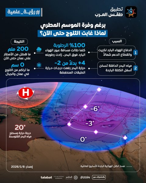 تطبيق طقس العرب - تشهد بلاد الشام بما في الأردن تتابع في وصول المُنخفضات الجوي خلال الأسابيع الماضية و لله الحمد مما أسهم في هطول كميات وفيرة من الأمطار مقارنة عمّا هو مُفترض هطوله حتى الآن، في حين غابت الثلوج عن أغلب مُرتفعات المملكة عدا قمم الجنوب (جبال الشراه) رغم تأثرنا بالعديد من الكتل الهوائية الباردة و الرطبة. فما سبب حدوث ذلك؟