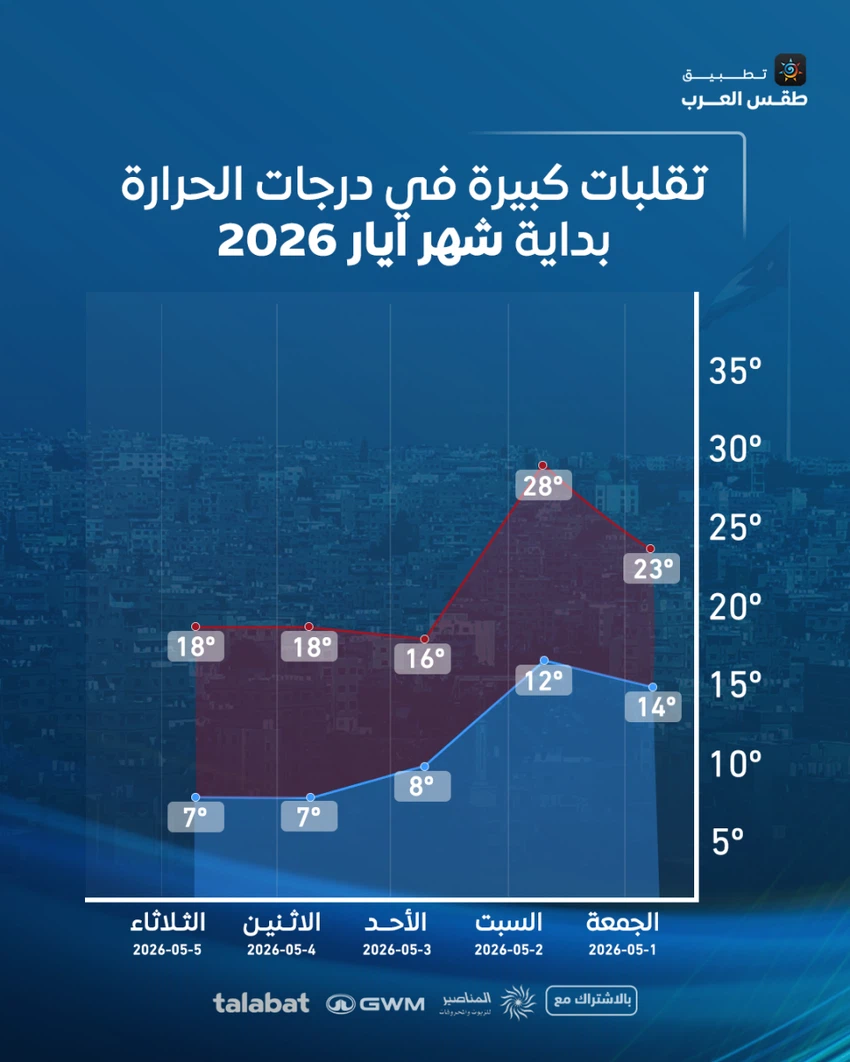 تشهد الأردن خلال بداية شهر أيام حالة واضحة من التقلبات الحرارية، تعكس الطبيعة الانتقالية لشهر أيار، حيث لا تزال الكتل الهوائية الباردة تنافس الدافئة على أجواء المنطقة.