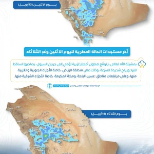 توقع المركز الوطني للأرصاد في المملكة العربية السعودية أن تتأثر العديد من مناطق المملكة هذا اليوم الثلاثاء 14-4-2026م بأحوال جوية غير مستقرة تعمل على تجدد نشاط السحب الركامية وهطول الأمطار المتوسطة والغزيرة أحياناً، يصاحبها تساقط زخات البَرد ورياح شديدة السرعة.