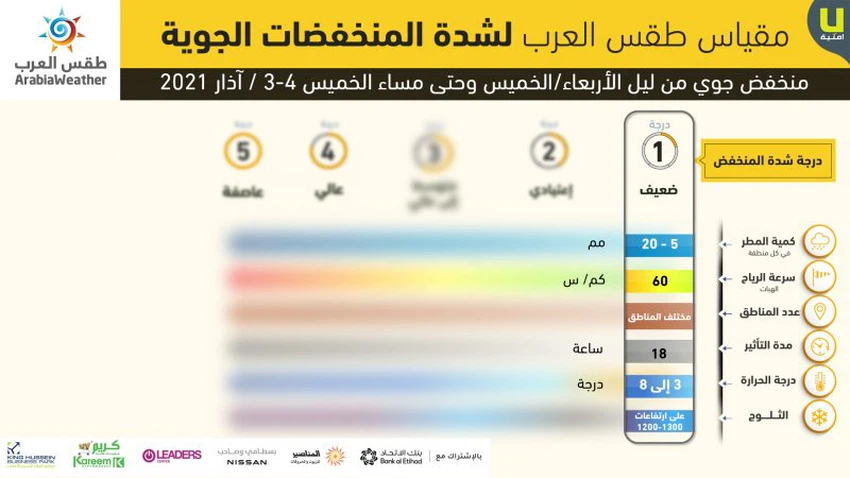 طقس العرب - خلال الساعات القادمة وتحديداُ مع ساعات الليل الأولى من اليلة الأربعاء/الخميس، تبدأ المملكة تتأثر بمنخفض جوي تم تصنيفه على أنه من الدرجة الأولى، وهي الدرجة الأضعف بحسب مقياس طقس العرب لقياس شدة المنخفضات الجوية، ويترافق هذا المنخفض الجوي بعدة ظواهر جوية نستعرضها بالتصميم التالي: