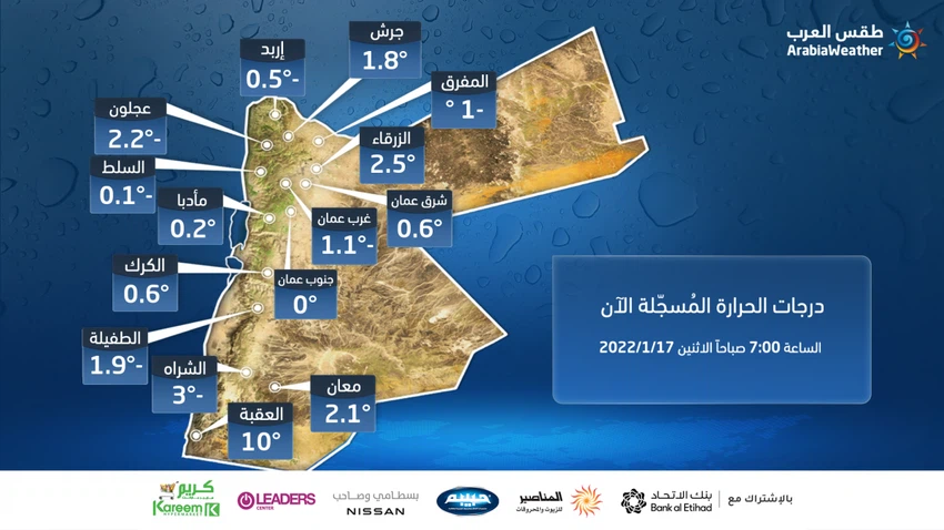 طقس العرب - تُسجّل شبكة محطات رصد طقس العرب و المنتشرة في مختلف مدن المملكة درجات حرارة متدنية للغاية صباح هذا اليوم الاثنين 17/1/2002.
