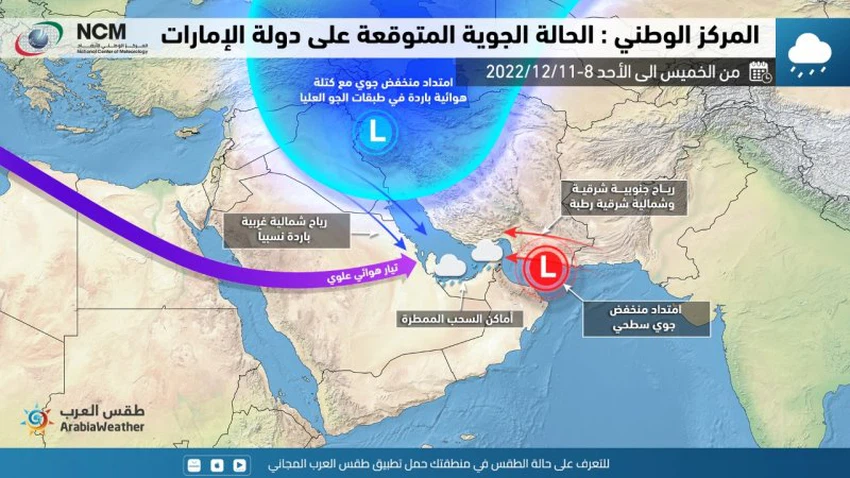 طقس العرب - قال المركز الوطني للأرصاد في دولة الإمارات بأن الدولة ستتأثر بمشيئة الله من يوم الخميس و حتى الأحد بامتداد منخفض جوي سطحي من الجنوب الشرقي يُصاحبه رياح جنوبية شرقية و شمالية شرقية رطبة مع امتداد مُنخفض جوي في طبقات الجو العُليا من الغرب يُصاحبه كتلة هوائية باردة.