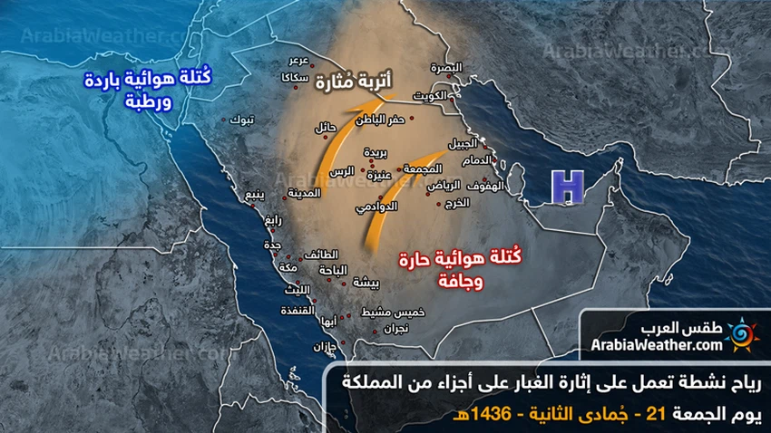 كما تسبب الكتلة الهوائية الباردة المؤثرة على شرق المتوسط وشمال غرب البلاد إثارة الأتربة والغبار على أجزاء واسعة من المملكة بسبب الاختلاف الحراري الكبير.