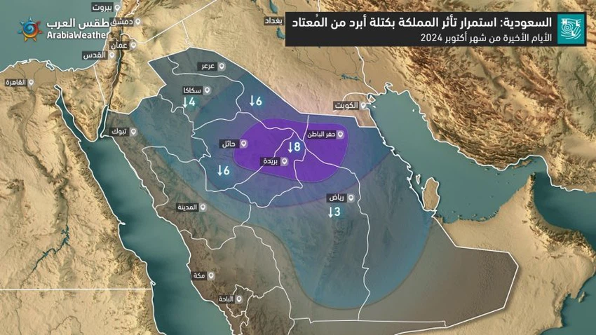 و تُشير ذات الخرائط الجوية في مركز طقس العرب إلى توقعات بأن تكون درجات الحرارة أبرد من مُعدلاتها المُعتادة لمثل هذا الوقت من العام في أجزاء عِدّة من شمال و وسط و شمال شرق المملكة خلال الأيام القادمة، بحيث تكون الأجواء أكثر اعتدالاً خلال ساعات النهار في أنحاء عِدّة من الحدود الشمالية و الجوف و القصيم و حائل و الرياض و شمال الشرقية و المُرتفعات الجنوبية الغربية مع درجات حرارة في مُستويات عشرينية.