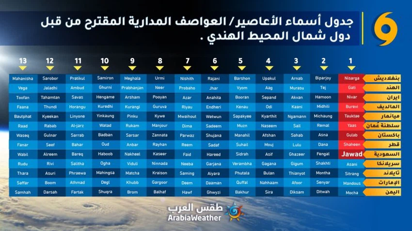 طقس العرب - تطور المنخفض المداري يوم أمس الجُمعة غرب خليج البنغال إلى عاصفة مدارية وتم اطلاق إسم "جواد" عليه، وهي تسمية مُقترحة من السعودية، حيثُ تجري تسمية الأعاصير التي تتشكل في شمال المحيط الهندي من قبل المركز الإقليمي المتخصص للأرصاد الجوية ومقره في (نودلهي - الهند) بالنيابة عن البلدان الأعضاء في المنظمة الدولية للأرصاد الجوية.