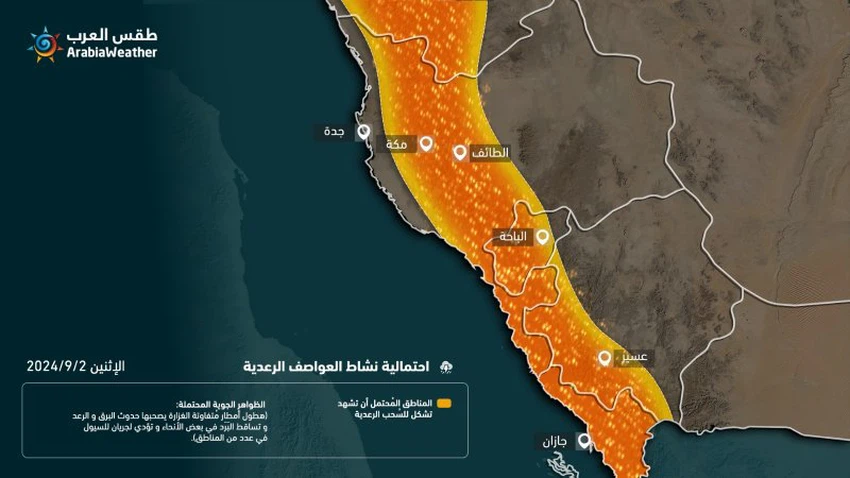 قال المُختصون في مركز طقس العرب بأنه يُتوقع أن تتهيأ الفرصة ساعات ما بعد الظهر من يوم الإثنين لتكاثر السُحب الركامية على أجزاء عِدّة من مُرتفعات و تهامة جازان و عسير و الباحة و مكة المكرمة و المدينة المنورة و يُرافقها هطول أمطار مُتفاوتة الغزارة مصحوبة بحدوث العواصف الرعدية و تساقط البَرَديات، مما يؤدي إلى جريان كبير للأودية و الشِعاب.