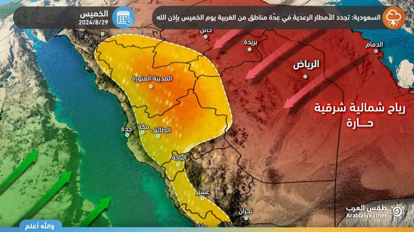 و أشار المُختصون في مركز طقس العرب بأنه يُتوقع أن تتهيأ الفرصة من بعد ساعات ظهر يوم الخميس إلى تكاثر السُحب الركامية على أجزاء مُتفرقة من مرتفعات جازان و عسير و الباحة و شرق مكة المكرمة و المدينة المنورة، و يُرافقها هطول أمطار مُتفاوتة الغزارة مصحوبة بحدوث العواصف الرعدية و تساقط البَرَد في بعض الأنحاء، مما يؤدي إلى جريان للأودية و الشِعاب.