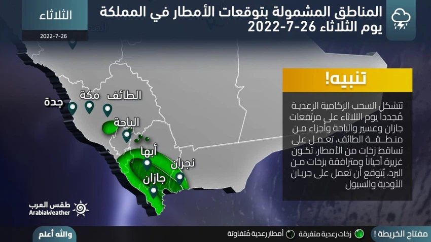 طقس العرب - سنان خلف - تُشير آخر مخرجات أنظمة المُحاكاة الحاسوبية لدينا في طقس العرب إلى تأثر المرتفعات الجنوبية الغربية والغربية من المملكة مُجدداً مع ساعات ظهر وعصر الثلاثاء بأحوال جوية غير مستقرة تترافق بالأمطار المتوسطة والغزيرة.
