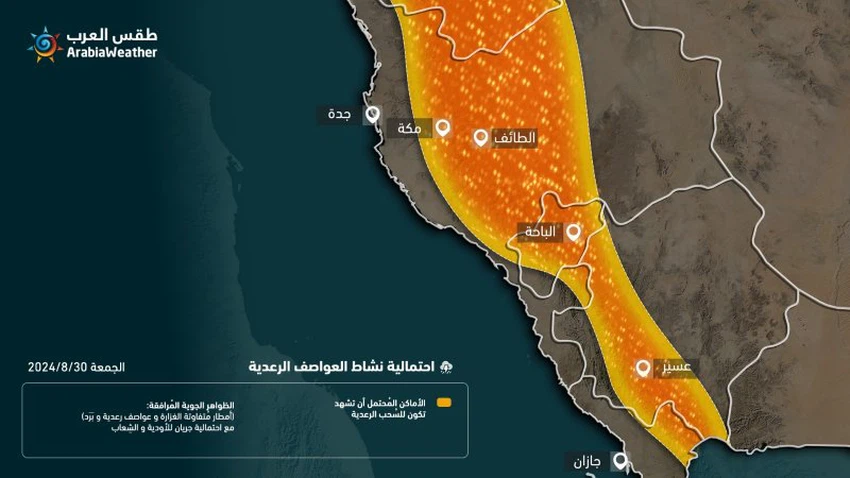طقس العرب - تُشير آخر الخرائط الجوية في مركر طقس العرب توقعات بأن تتجدد الأمطار الرعدية على أنحاء عِدّة من الجنوبية الغربية و الغربية للمملكة السعوية يوم الجمعة 2024/8/30 و ذلك نتيجة استمرار تدفق الرطوبة المدارية للمنطقة و هي مرافقة لتقدم الحزام المداري الوهمي.