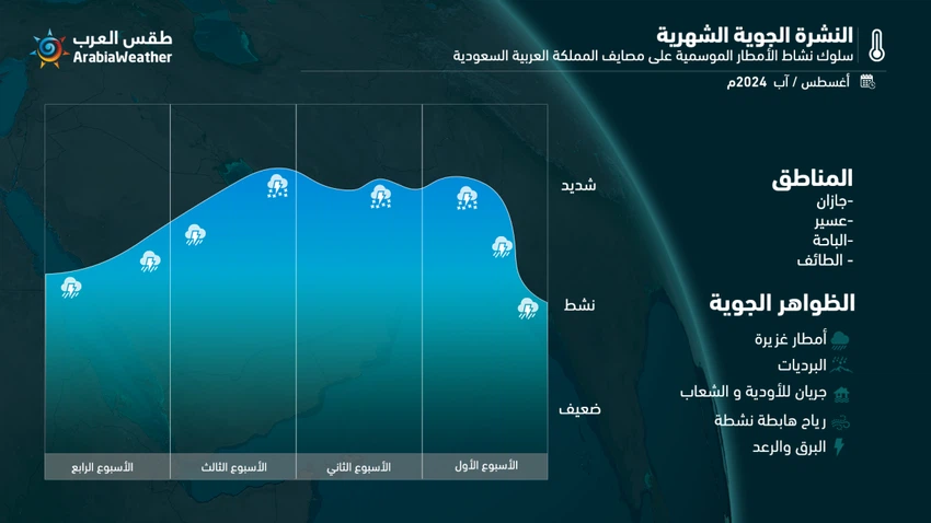 طقس العرب - سنان خلف - تُشير آخر تحليلات فريق التنبؤات الجوية في "مركز طقس العرب الإقليمي" إلى أن الأجزاء الجنوبية الغربية والغربية من المملكة ستحظى خلال شهر أغسطس الجاري بعد مشيئة الله بكميات أمطار أعلى من المعدلات المُعتادة مقارنة بمثل هذا الوقت من العام.