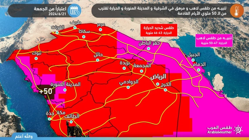 وفي التفاصيل فيُتوقع أن يزداد تأثر منطقة حفر الباطن يكتلة هوائية شديدة الحرارة ترفع درجات الحرارة لمستويات تقترب من حاجز الـ 50 درجة مئوية، وبالتالي تسود أجواء حارة ومرهقه، كما و تتأثر أجزاء مختلفة من منطقة المدينة المنورة بأجواء شديدة الحرارة، مع درجات حرارة تكون حول الـ 50 درجة مئوية يومي الجمعة والسبت، كما هو موضح من خلال الخارطة المرفقة.