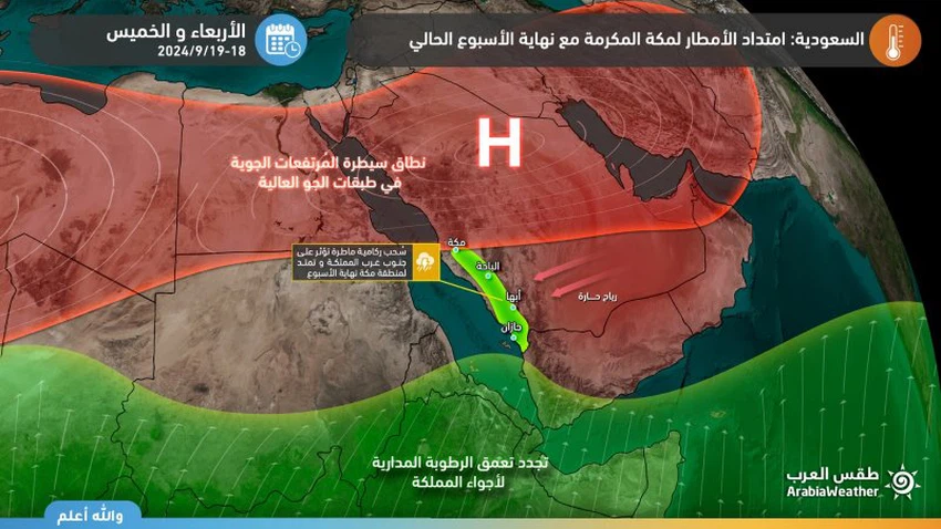 و لكن مع نهاية الأسبوع، يتم مراقبة أن يمتد نشاط السُحب الركامية لمنطقة مكة المكرمة و قد تطال الطائف و مُرتفعات جنوب شرق و شرق مكة.