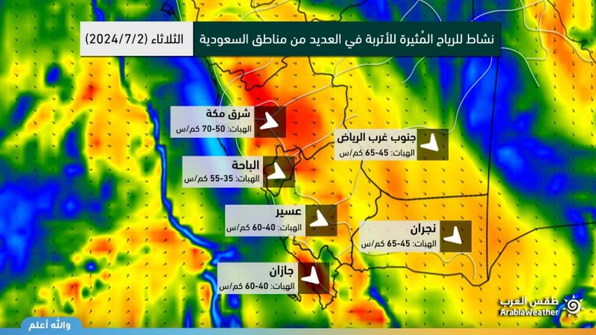 و تُبيّن ذات الخرائط الخاصة بمحاكاة الرياح في مركز طقس العرب أن تنشط الرياح الشمالية الغربية على أجزاء عِدّة من مناطق جازان و عسير و نجران و مكة المكرمة خاصة شرق المُرتفعات و تترافق بهبات قوية أحياناً تتجاوز حاجز 60 كم/الساعة و تؤدي إلى اثارة الأتربة و تدنٍ في مدى الرؤية الأفقية خاصة في المناطق المفتوحة و الطرق السريعة.