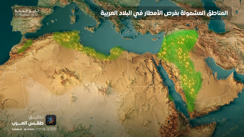 طقس العرب - تُشير آخر مخرجات النمذجة الحاسوبية وتحاليل فريق التنبؤات الجوية في طقس العرب إلى تأثر العديد من الدول العربية خلال الأسبوع الحالي بأحوال جوية غير مستقرة، تترافق بعد مشيئة الله بهطول أمطار يرفقها حدوث البرق والرعد والصواعق، وتساقط زخات البَرَد في 12 دولة عربية، إضافة لنشاط الرياح السطحية المثيرة للأتربة والغبار.