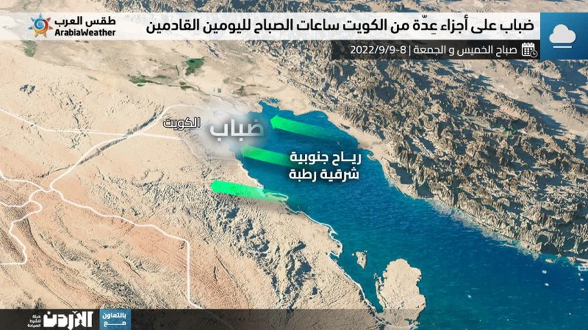 طقس العرب - يُتوقع بمشيئة الله أن تتهيأ الظروف الجوية بُعيد ساعات مُنتصف ليل الأربعاء/الخميس وصباح الخميس لتشكل الضباب على أجزاء عِدّة من الكويت بما في ذلك المناطق الساحلية منها، والذي قد يكون كثيفاَ أحياناَ.