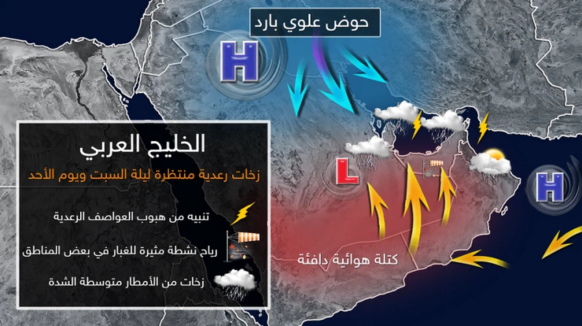 كما يتواجد منخفض جوي سطحي الى الجنوب الشرقي من الجزيرة العربية يدفع بكتلة هوائية دافئة من الجنوب، ويؤدي تقابل الهواء الدافئ القادم من الجنوب مع الحوض العلوي البارد من الشمال الى نشوء أحوال جوية غير مستقرة.