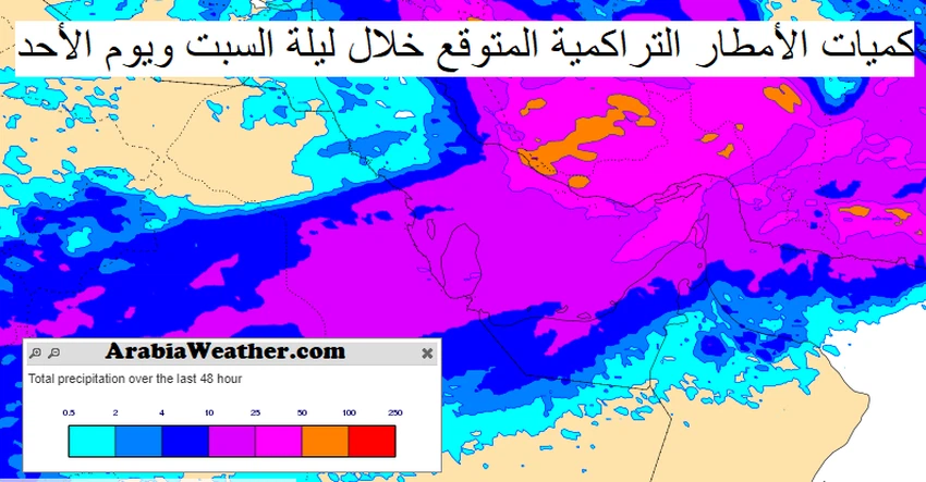 بمشيئة الله تزداد غزارة الأمطار (ليلة السبت ويوم الأحد) بشكل تدريجي وتشمل الأجزاء الداخلية منها خاصة الهفوف والاحساء وتصل لبعض السواحل مثل الدمام والجبيل، إضافة الى المناطق الحدودية الواقعة بين الامارات وقطر مثل البطحاء وتكون شدة الهطولات متوسطة بوجه عام، ويحتمل أن تهب رياح نشطة مثيرة للغبار خاصة أثناء تأثير العواصف الرعدية، تضعف الأمطار مع ساعات النهار، على أن تنحسر بشكل كلي مساءً.