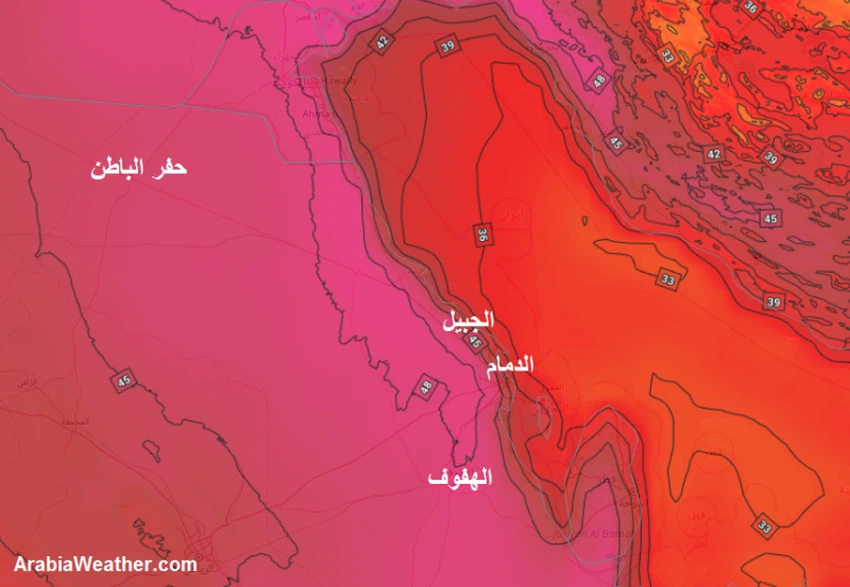 حيث يطرأ ارتفاع تدريجي على درجات الحرارة، حيث تصبح حول 45 درجة مئوية على السواحل، وأكثر من ذلك في المناطق الداخلية كالإحساء والهفوف، اذ قد تقترب من الخمسين درجة مئوية، وتبين الخريطة التالية درجات الحرارة العظمى المتوقعة خلال الايام القادمة،