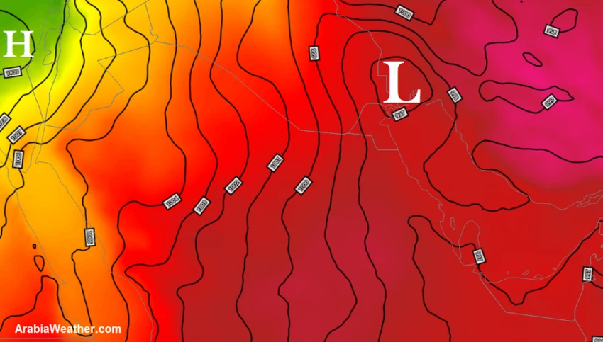 ويعود سبب ذلك الى اشتداد تأثير سيطرة الكتلة الحارة على أجواء الجزيرة العربية خلال الأيام القادمة، تترافق مع تعمق منخفض الهند الموسمي بقيم قد تصل الى 997 مليبار نواحي الكويت وجنوب شرق العراق.