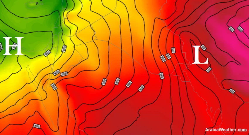 ويعود سبب نشاط الرياح الى اندفاع كتلة هوائية أكثر برودة شمال المملكة، قادمة عبر شرق البحر المتوسط وبلاد الشام، تعمل على زيادة فرق الضغط الجوي بينها وبين منخفض الهند الموسمي شرقاً، حسبما تبين الخريطة المرفقة لتوزيع الكتل الهوائية والضغط الجوي السطحي.