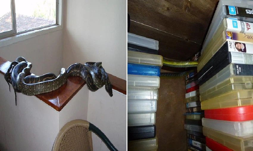 أما النتيجة فجاءت في صور لا تصدق، لأفاعي بالأركان والحدائق، منها ما هو معلّق في السقف فوق لمبات الإضاءة وبين أرفف الكتب وعلى السلم وحتى على حبال الغسيل.
